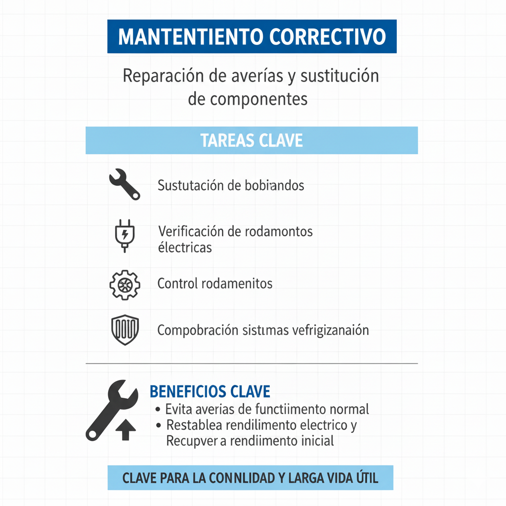 Cuando se detectan fallos o desgastes significativos, el mantenimiento correctivo actúa para restablecer el funcionamiento normal del equipo. Esto puede incluir la sustitución de bobinados, rodamientos, ventiladores o sistemas de refrigeración.