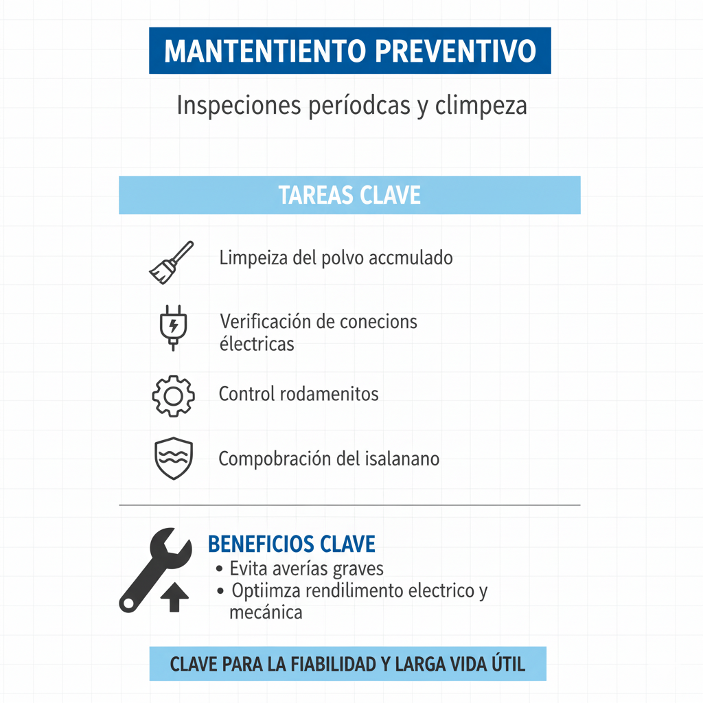 El mantenimiento preventivo se centra en la revisión programada de componentes clave. Incluye la limpieza del polvo acumulado, la verificación de conexiones eléctricas, el control de rodamientos y la comprobación del aislamiento.